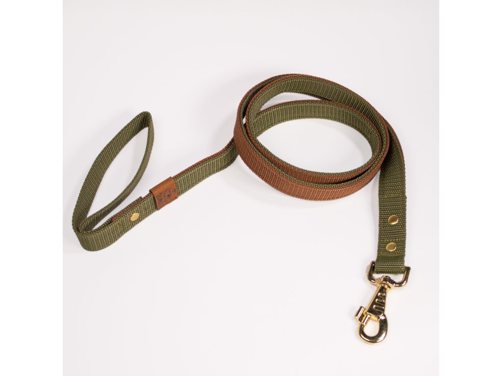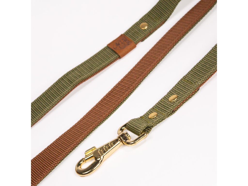 Mimořádně pevné dvouvrstvé hnědo-zelené vodítko ze dvou spojených popruhů se zlatými a koženými prvky. Ideální pro velké a silné psy. Vyrobené ručně v ČR pro sport, trénink i každodenní procházky. Délky 150 a 170 cm.