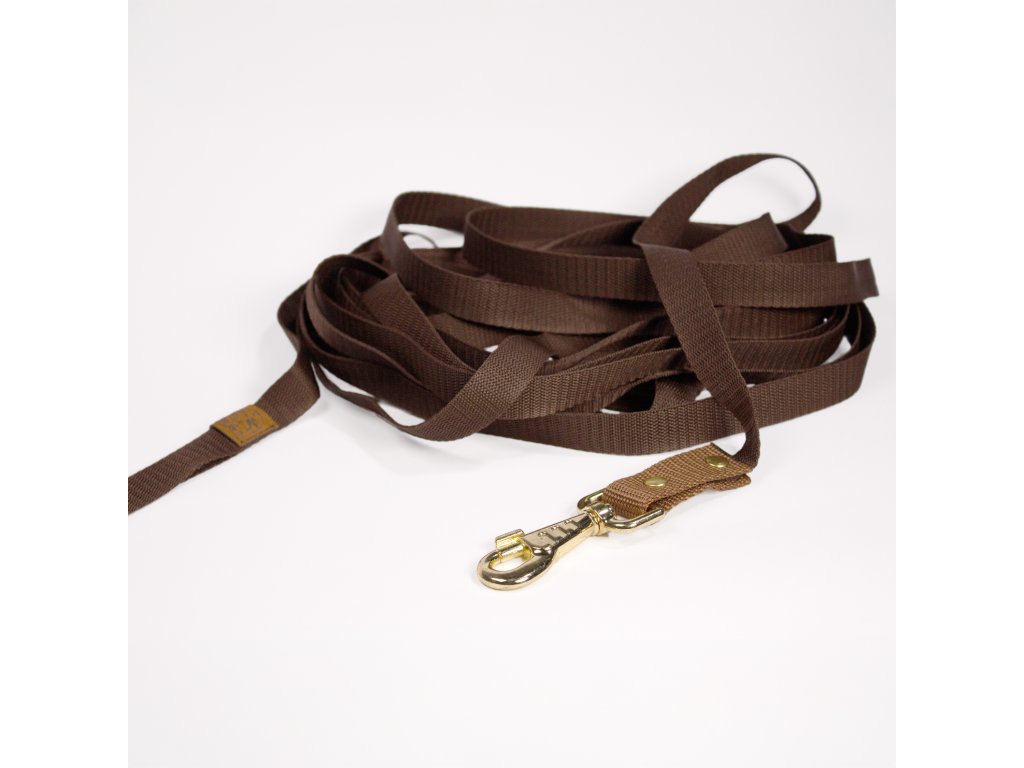 Odolná hnědá stopovačka ručně vyráběná v Česku. Ideální pro přivolání, stopování, nácvik volnosti i bezpečný trénink na dálku. K dispozici délky 5 m, 8 m, 10 m a 15 m. Pevná celokovová zlatá karabina, zlaté a kožené prvky, lehký popruh a pohodlné vedení.
